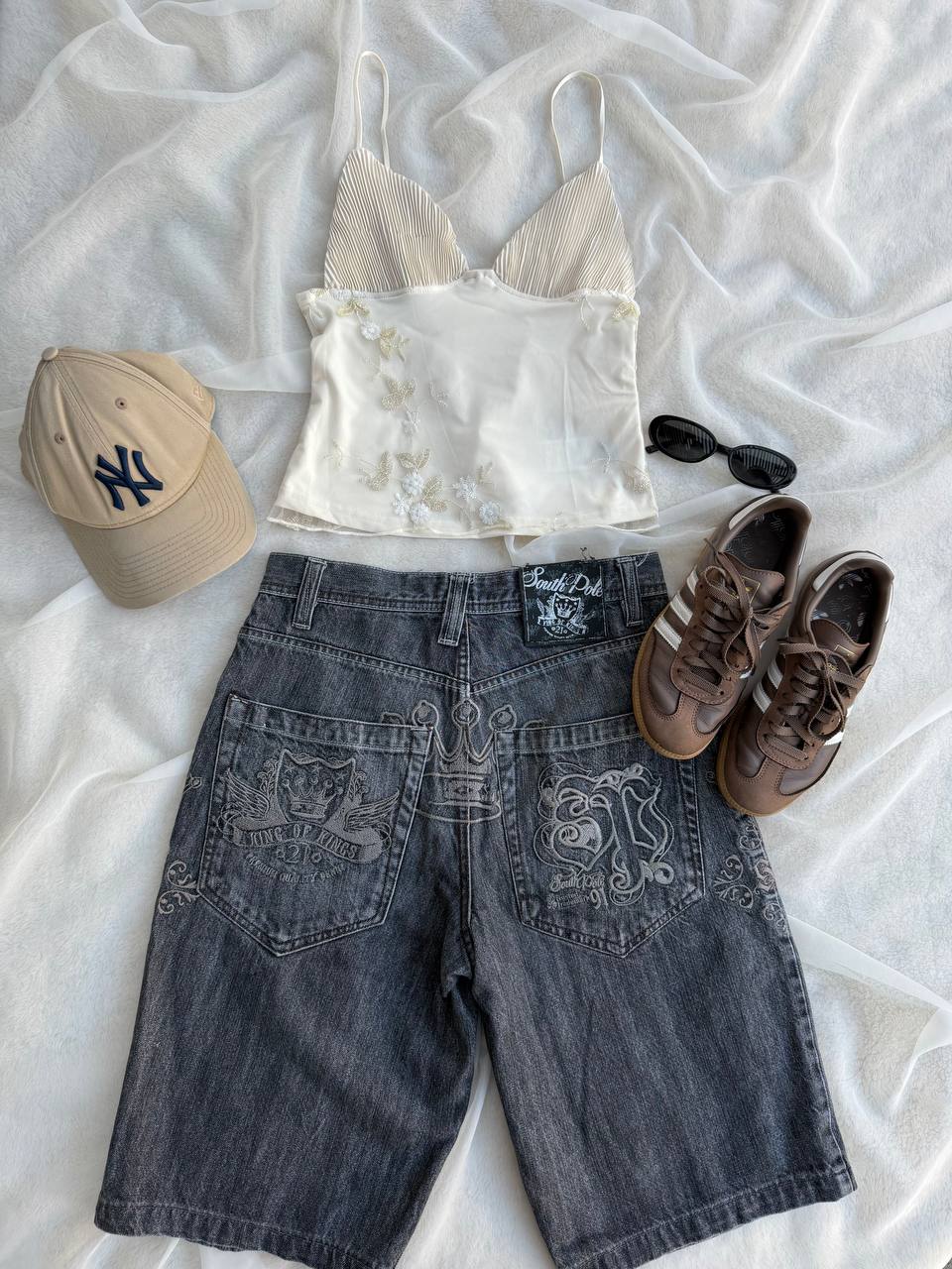 - Shorts estilo bermuda, modelo muy único, con bordados delanteros y traseros y fit anchito.