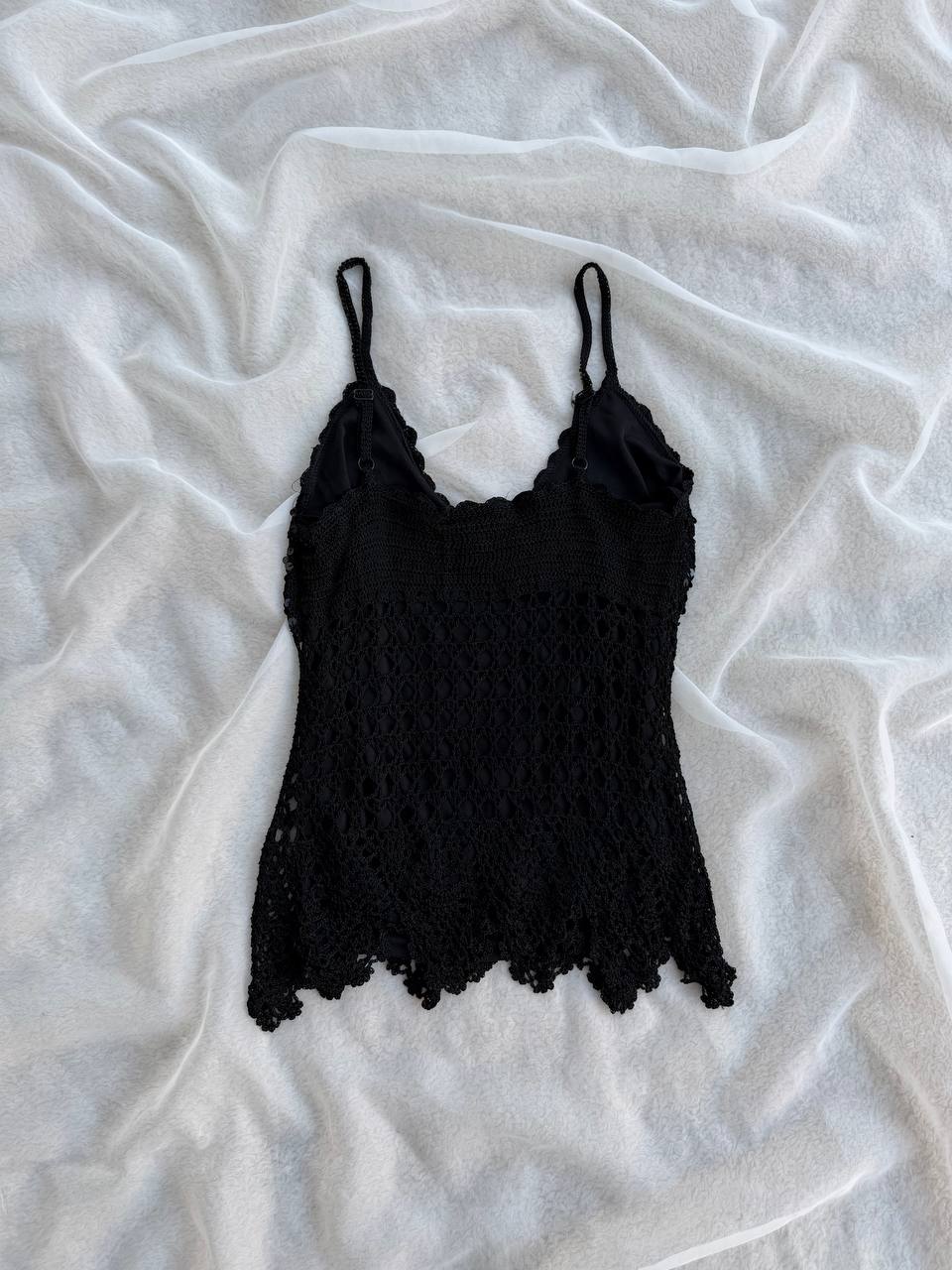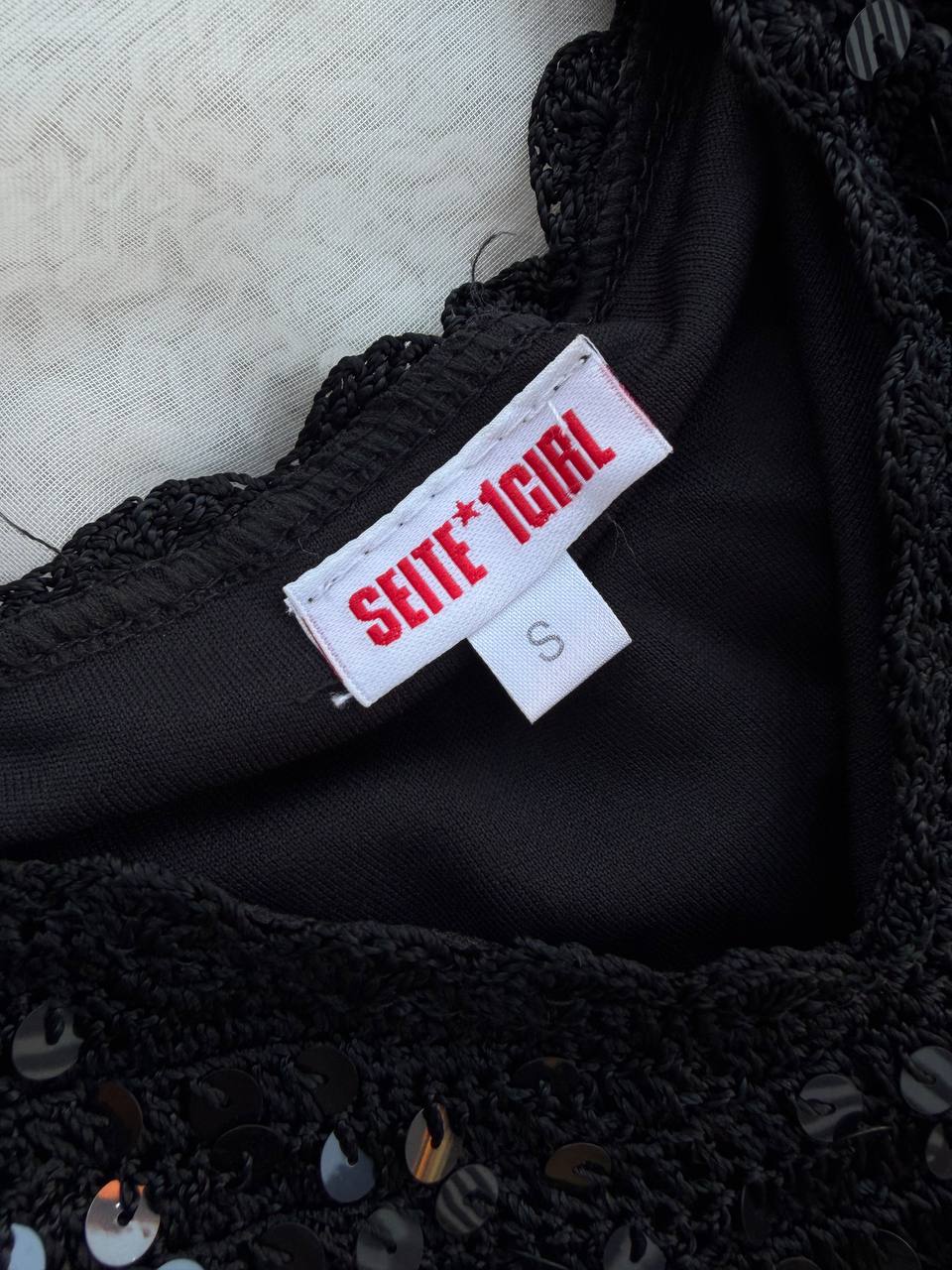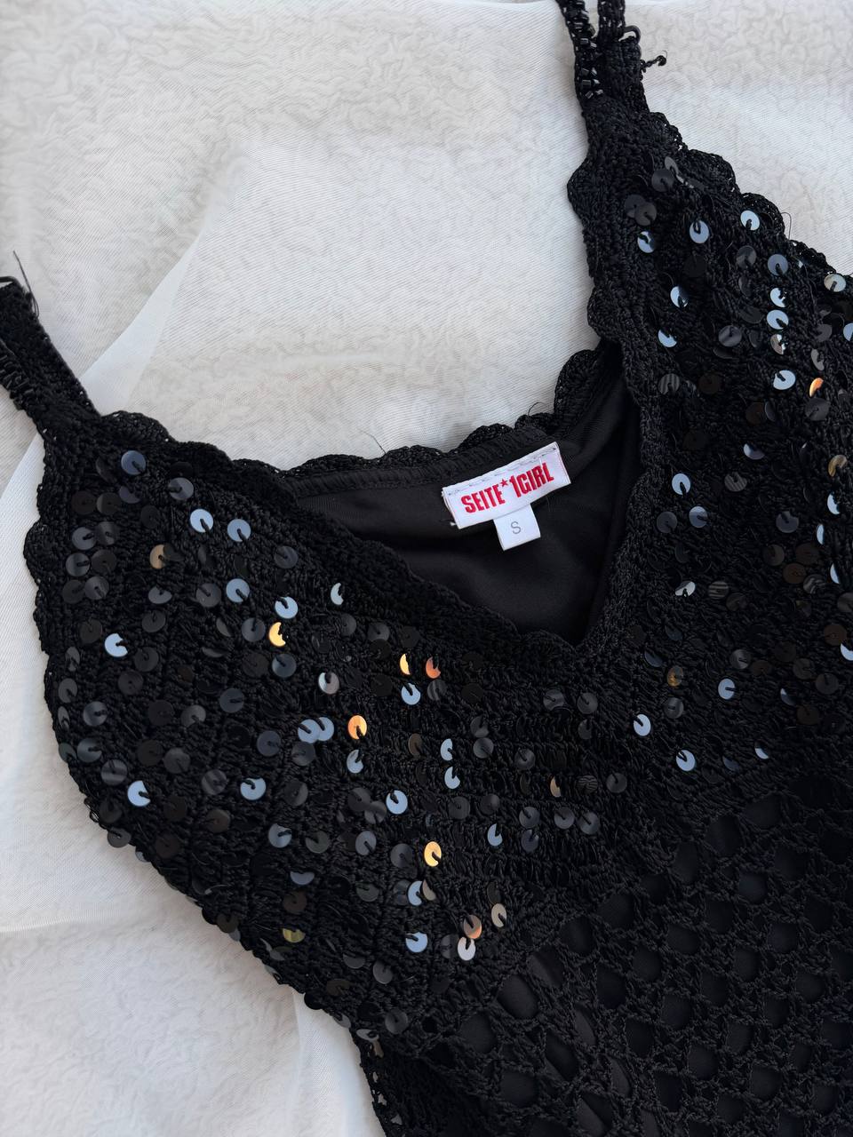 - Top negro de hilo con lentejuelas y mostacillas, modelo full ajustado y maravilloso con forro.